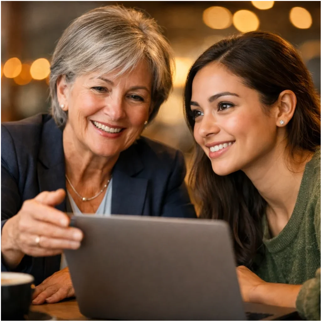 Figure 2: A senior female tech executive mentoring a young developer, embodying the “Give To Gain” theme through knowledge sharing and support.