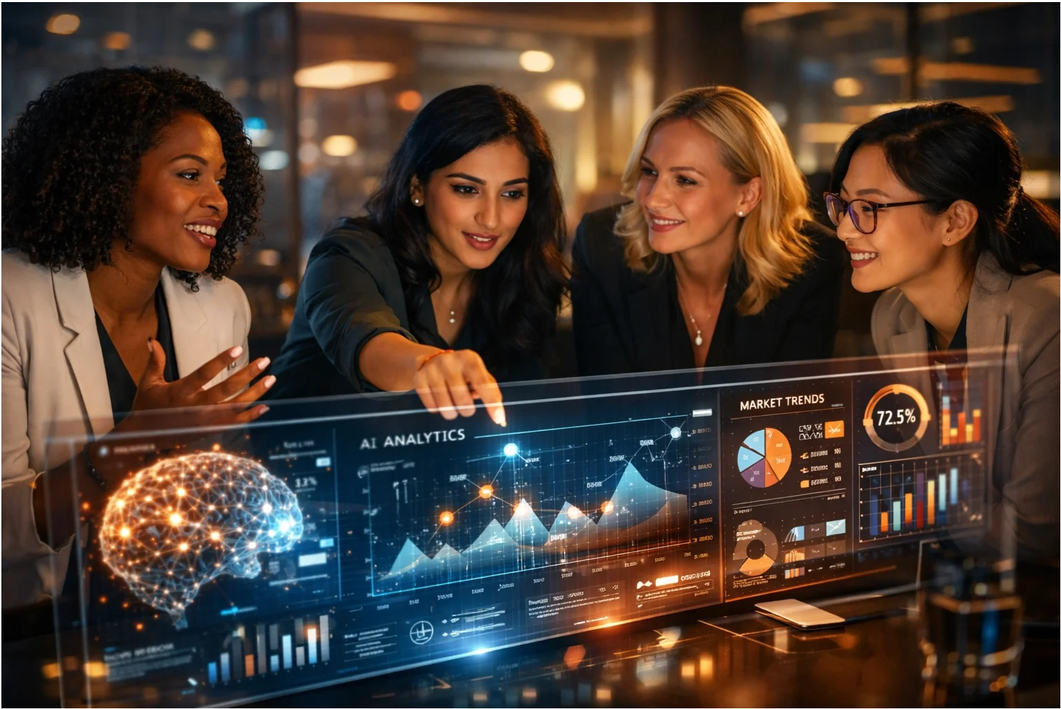 Figure 1: A diverse group of women leaders collaborating in a futuristic tech office, symbolizing their growing influence in innovation and marketing analytics.